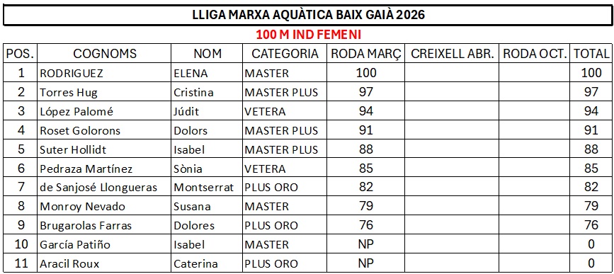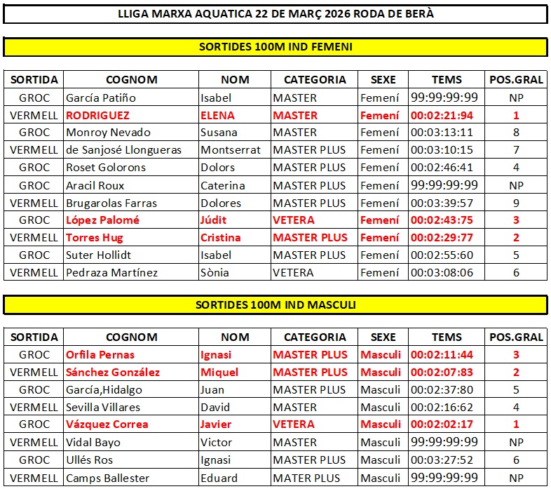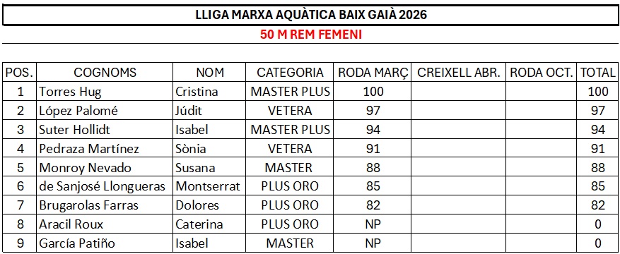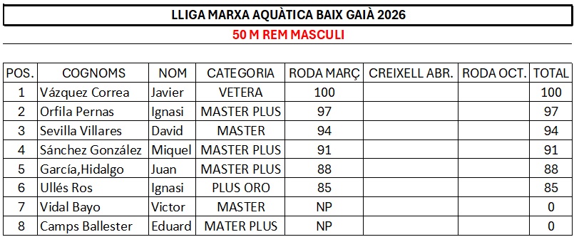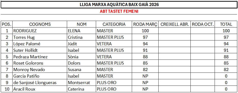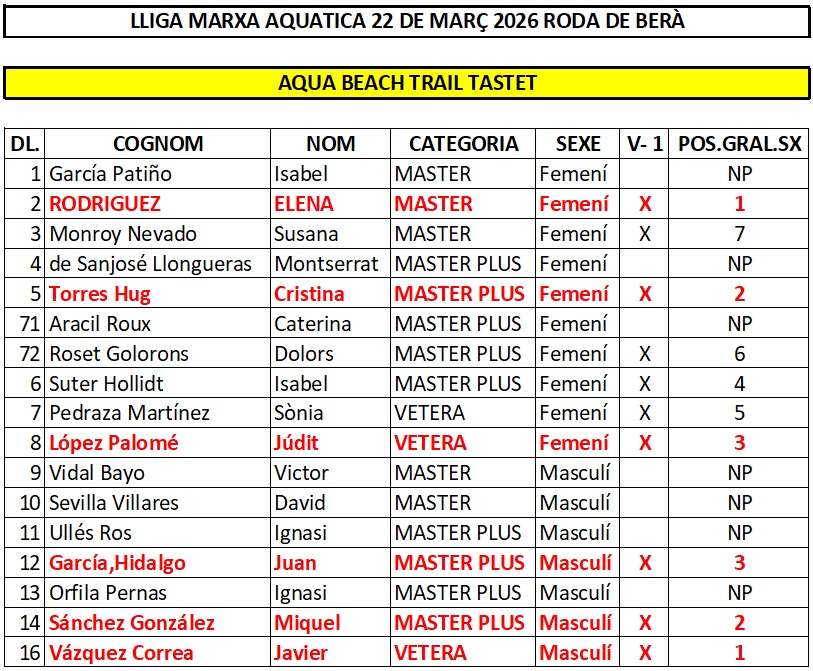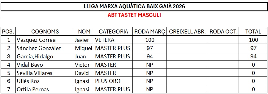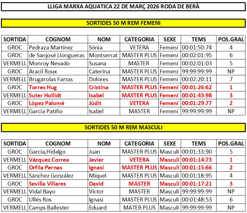 RESULTATS LLIGA MARXA AQUÀTICA BAIX GAIÀ 2026